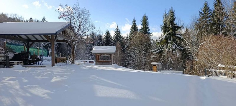 Nabízíme vám k pronájmu Chalupu na Hamrech na polosamotě, v nádherné krajině CHKO Beskydy, obklopenou lesy a loukami. Díky své poloze, daleko od civilizace (nejbližší soused je 400m) a rušných cest, vybízí chalupa k odpočinku, relaxaci a klidu. Jestli si chcete odpočinout a vypnout hlavu, je tato chalupa přímo pro vás. Můžete zde houbařit, sbírat borůvky nebo si užívat horskou turistiku. Na velké oplocené zahradě je k dispozici bazén, posezení v altánu, velké pískoviště a domek pro děti, malá skluzavka, trampolína, ohniště s grilovacím roštem. V noci si tady můžete užít nebe plné hvězd (oblast Beskydské tmavé oblohy s téměř nulovým světelným smogem), takže pokud máte doma hvězdářský dalekohled určitě ho přibalte sebou.