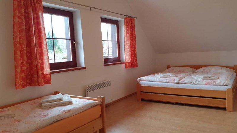 Chalupa v obci Frenštát pod Radhoštěm: 4 ložnice, celkem pro 5 až 12 osob. Orientační cena (za osobu za noc): celoročně 600kč.