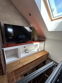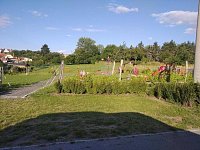 Za chalupou je další možnost posezení u dětské prolézačky.