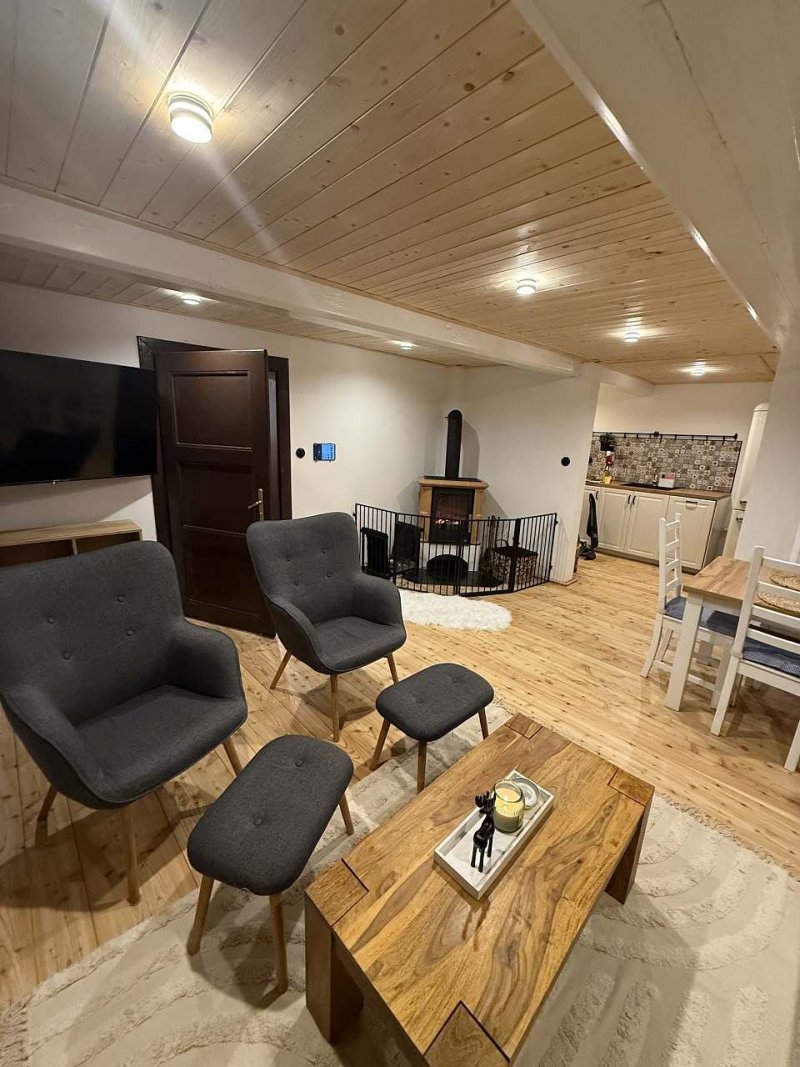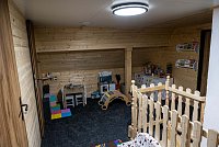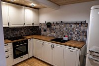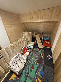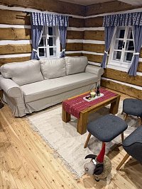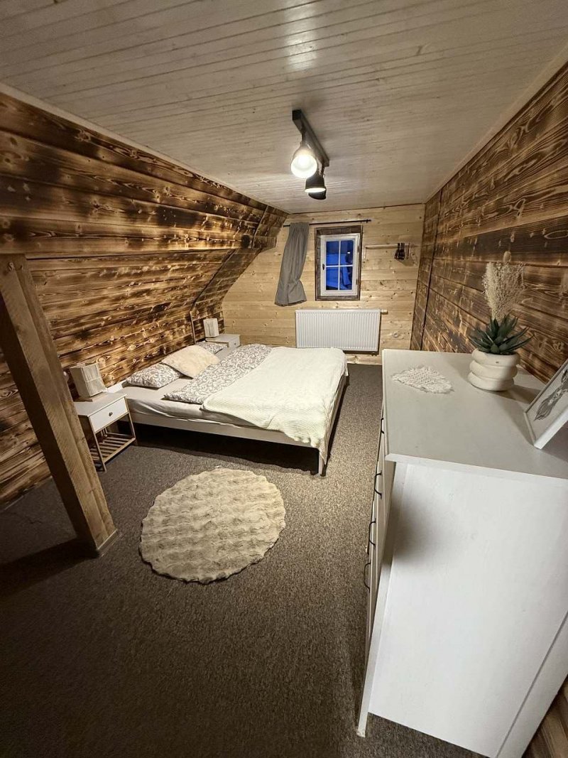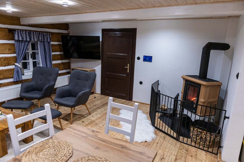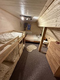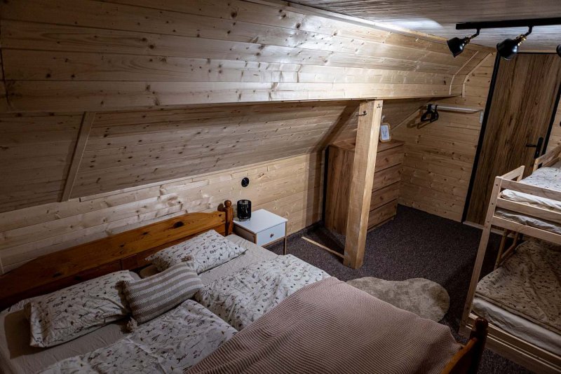 Uvnitř chalupy vás čeká krásná, plně vybavená kuchyň spojená s obývacím pokojem a krbem, tři útulné ložnice a dětská herna plná hraček. Na chalupě se také nachází jídelní židlička pro ty nejmenší, ať to mají u nás také pohodlné. K dispozici jsou dvě WC a jedna koupelna, což zajišťuje pohodlí i pro větší skupiny. Kapacita chalupy je 8 osob s možností dvou přistýlek.