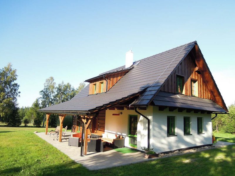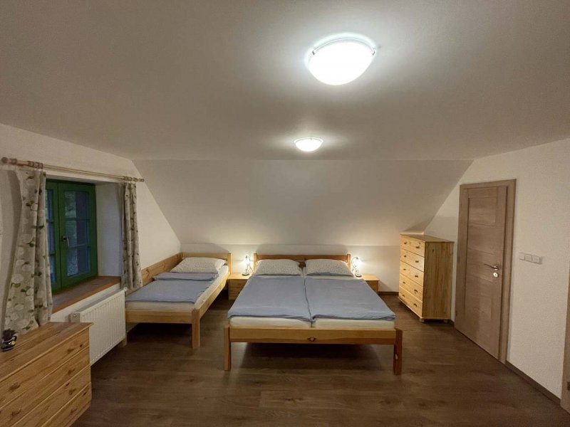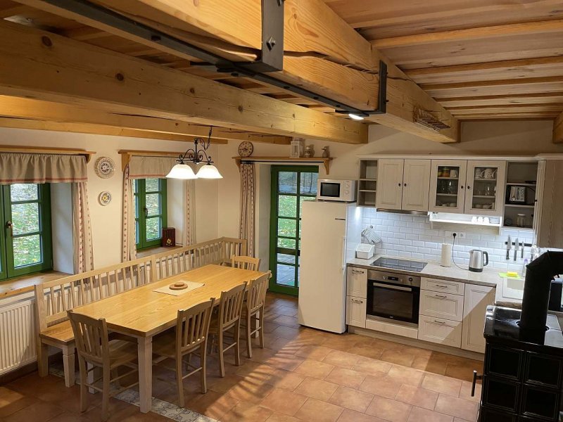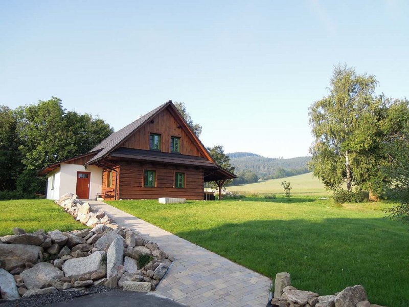 Nabízíme pronájem vyladěné chalupy v nádherném prostředí luk a lesů. 2x ložnice po 4 a 5 lůžkách, každá s vlastní koupelnou a soc. zařízením, prostorná světnice s kachlovými kamny a kuchyní, velká zahrada, krytá terasa, gril, atrakce pro děti.