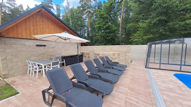 Součástí jsou terasy s posezením. U chalupy krytý bazén se slanou vodou. Zahrada nabízí prostor pro relaxování či aktivní odpočinek s dětmi. Parkování přímo u chalupy na zaploceném pozemku. Přilehlý přístavek pro úschovu kol a sportovního vybavení.