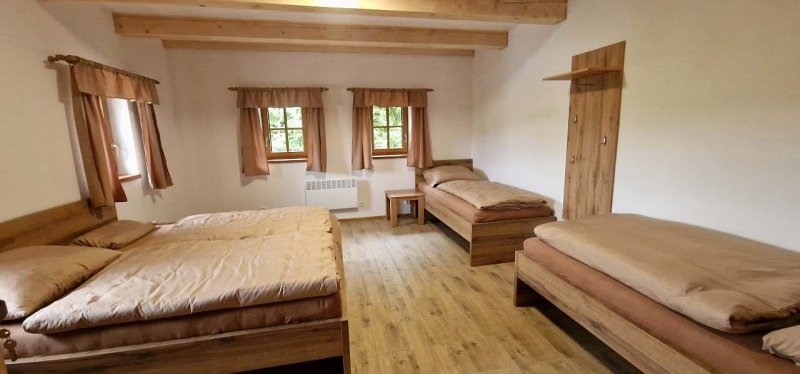 Chalupa v obci Lipová-lázně: 6 ložnic, celkem pro 1 až 17 osob. Orientační cena (za osobu za noc): léto 375kč, zima 395kč.