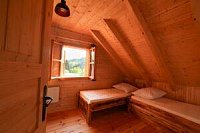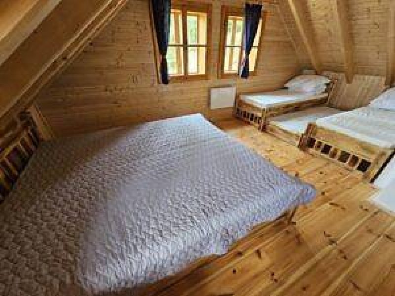 V chalupě se vyspí celkem 9 lidí. Ideální je pro dvě rodiny, protože v horním patře jsou dva pokoje. V jednom jsou 4 postele, ve druhém 5.