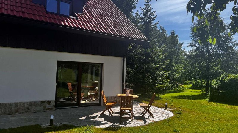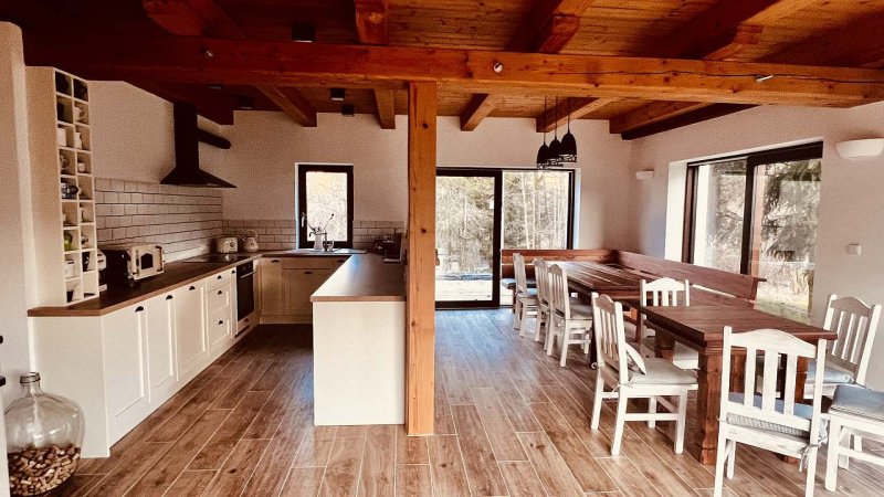 Chalupa disponuje třemi ložnicemi, třemi koupelnami se sprchovým koutem, velkou předsíní a rozlehlým obývacím prostorem propojeným s jídelnou a kuchyní. Zde se nacházejí krbová kamna na dřevo, která vytvářejí příjemnou atmosféru během chladnějších večerů – dřevo je samozřejmě zahrnuto v ceně pobytu. Kuchyně je plně vybavena pro vaše kulinářské zážitky. V ceně pronájmu je zahrnuto také povlečení a ručníky, takže si nemusíte dělat starosti s balením.
