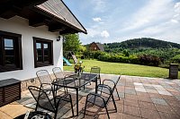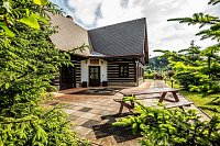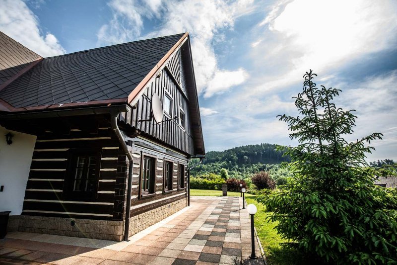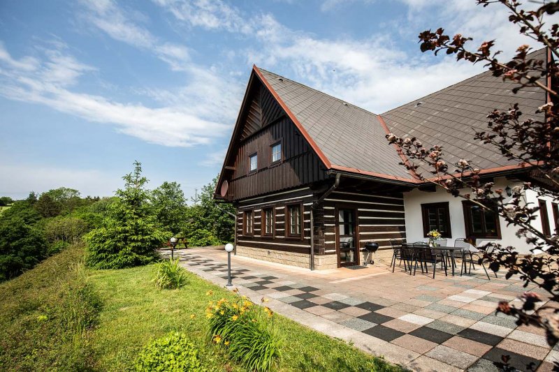 Kolem celé chalupy je velká dlážděná terasa s výhledem na okolní přírodu. Exteriér si můžete prohlédnout na [tomto videu* https: //youtu. be/mRbKqT5_TyA], interiér roubenky na tomto [tomto videu* https: //youtu. be/5nVKOhUZhKg].