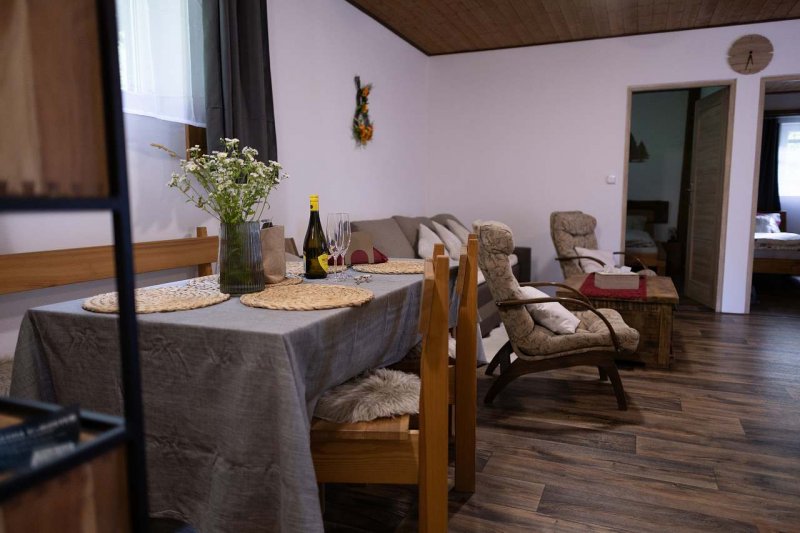 Apartmán v obci Mikulovice: 2 ložnice, max. 6 osob. Orientační cena (za apartmán za noc): léto 2.850kč, zima 2.650kč.