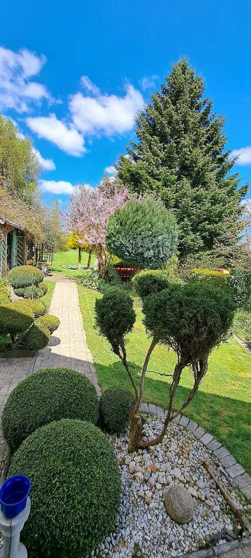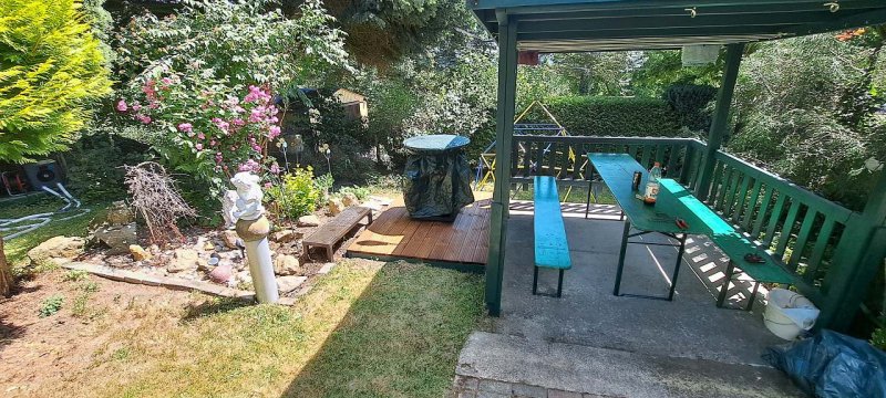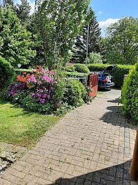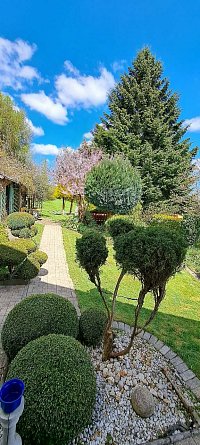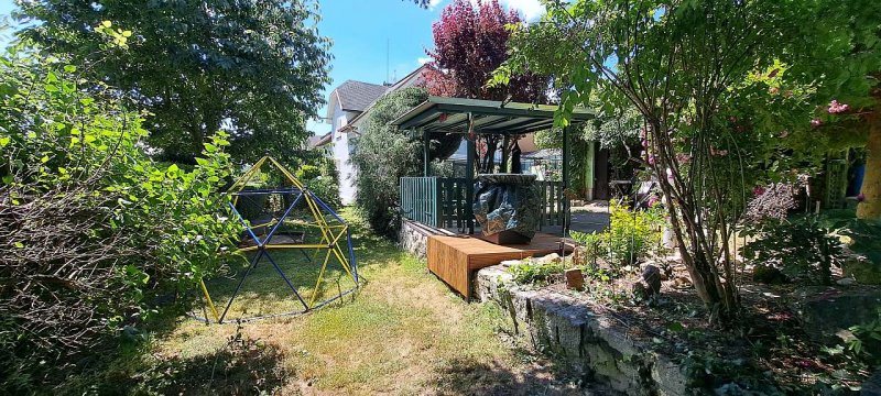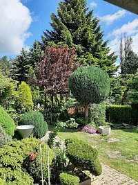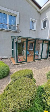 Kolem domu je oplocená krásná a udržovaná zahrada s pergolou, vyhřívaným bazénem, trampolínou, dětským domečkem se skluzavkou.