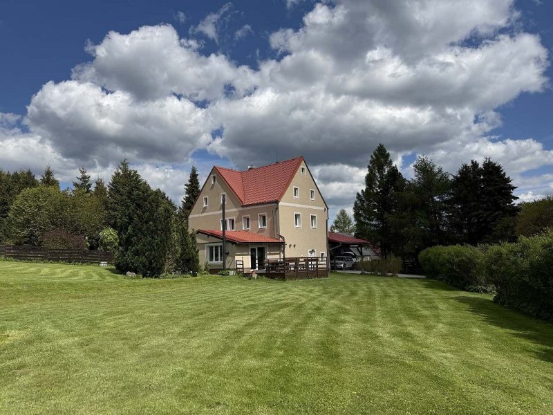Nově zrekonstruovaná nekuřácká chalupa s přímým výhledem na Klínovec v Krušných horách. Objekt je pronajímán pouze vcelku bez správce. - 7 ložnic pro 21 osob s možností objednání 3 placených přistýlek, kuchyně, jídelna, společenská místnost, dětská herna, krb, infrasauna, parking pro 15 aut, wifi, gril, TV, zamykatelný prostor na kola/lyže, různá venkovní sezení, 5 koupelen, 5 toalet. Automatické vytápění. Max. komfort, klid a soukromí.