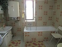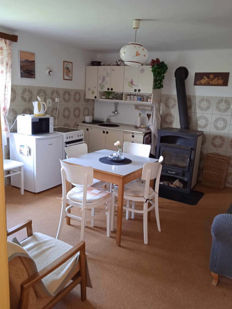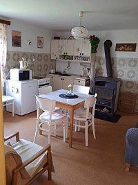 Obytná kuchyně je vybavena sporákem, průtokovým ohřívačem, sektorkou, mikrovlnkou, lednicí, plochou TV. V koupelně je bojler na ohřívání vody, vana a WC. Před domem velká terasa se zahradním nábytkem a ohništěm, vše oploceno pro pohyb malých dětí. Výhled na Sněžku, z druhé strany domu na V. Deštnou.