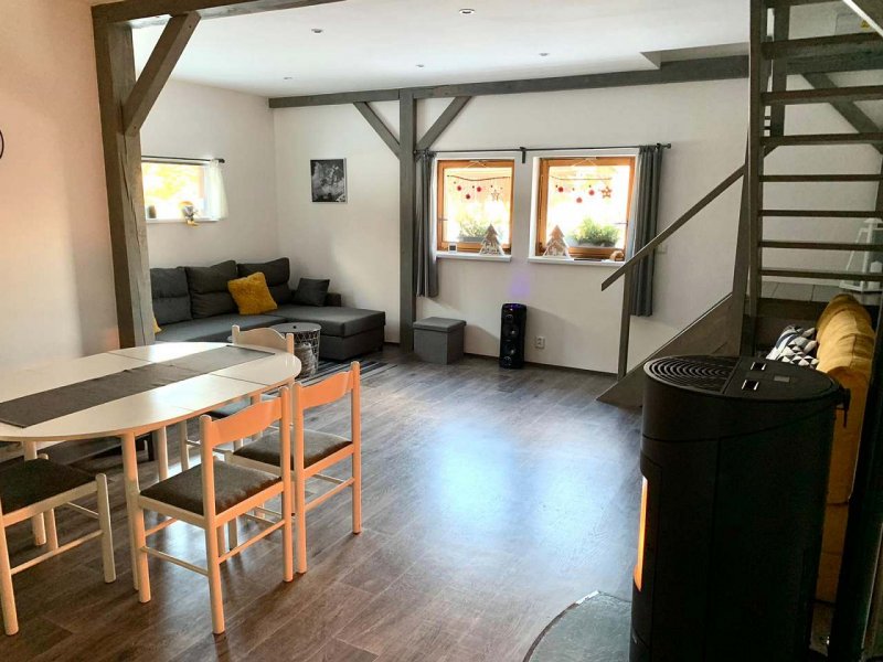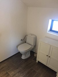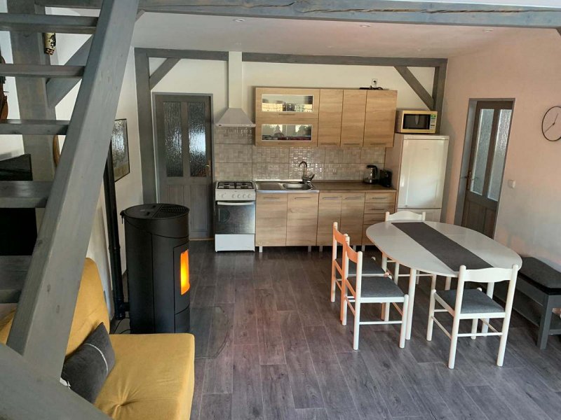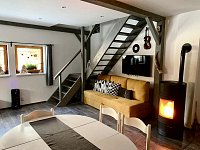 Vytápění chaty je zajištěno peletovými kamny a přímotopy pro případné přitopení.