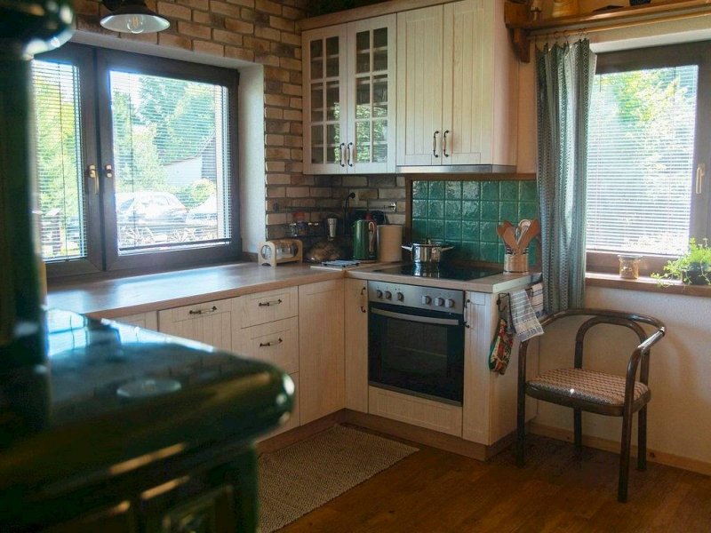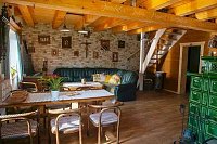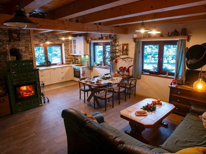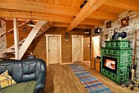 Na prízemí sa nachádza vstupná chodba, spoločenská miestnosť spojená s kuchyňou a kúpeľňa so sprchovacím kútom, umývadlom a toaletou. Srdcom obývacej miestnosti je kachľová pec s krbom. Samozrejmosťou je pohodlná gaučová súprava, televízor so satelitným príjmom a jedálenské posedenie, za ktoré sa zmestí celá rodia.