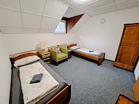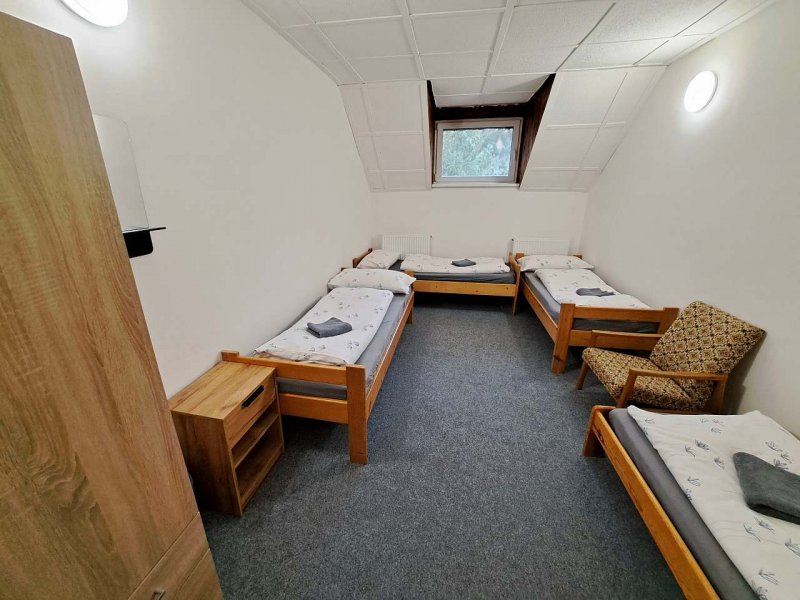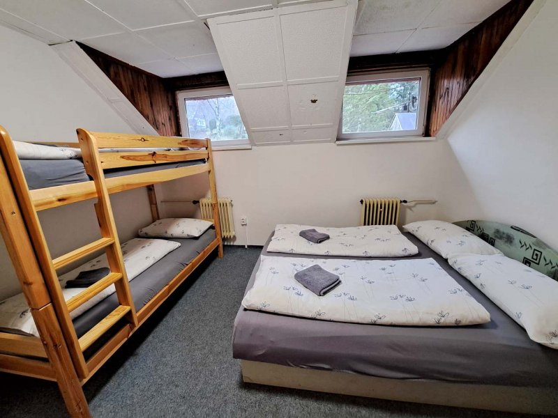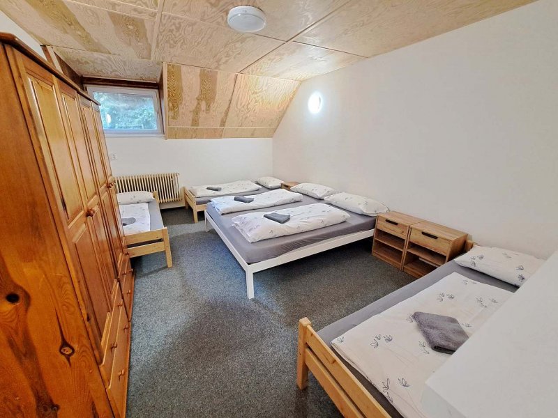 Chata nabízí ubytování pro skupiny přátel nebo rodiny s dětmi, je ideální také pro dětské kolektivy (školy v přírodě, tábory, klubová soustředění apod. ). Ubytování v 6 pokojích po 2 - 5 lůžkách v 1.patře budovy. V přízemí je veliká společenská místnost s kapacitou až 50 míst k sezení a prostorem pro hry a zábavu, kuchyňským koutem vybaveným potřebným nádobím, lednicí, varnou konvicí, myčkou, sporákem i mikrovlnkou. Za poplatek zapůjčíme i výčep.