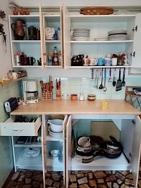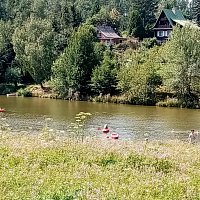 Chata na břehu krásného rybníka, lze pronajmout i vedlejší menší a levnější chatu pro 4 osoby, nebo obě s možností koupání a půjčení loďky. Téměř celý příjezd k chatám je po asfaltové komunikaci s možností parkování na vlastním oploceném pozemku. Vstup do chaty je z terasy do zádveří, odtud možno na záchod s umyvadlem, do pokoje nebo kuchyně a dalšího pokoje, jídelny, nové ložnice a koupelny se sprchou. Po strmém schodišti vystoupáme do spojené ložnice (s jedním balkonkem) v první části dvojlůžko a ve druhé tři samostatná lůžka s nočními stolky a lampičkami. Jako přistýlky lze použít 3 skládací pohovky v obýváku nebo dvojlůžko v pokoji. Na terase je k dispozici zahradní nábytek. Součástí zastřešeného posezení s venkovním krbem jsou dětské houpačky. Venkovním schodištěm z terasy sejdeme k ohništi a venkovní solární sprše (úspora elektřiny na ohřev) a také do suterénu, s možností uložení kol. V nově postavené koupelně ( 2025) je umyvadlo, se sprchovým koutem. V roce 2025 bude započatá oprava rybníka. Cena pobytu zahrnuje spotřebu vody. V ceně není zahrnuta spotřeba el. (8kč. kw) Platí se na místě dle spotřeby.