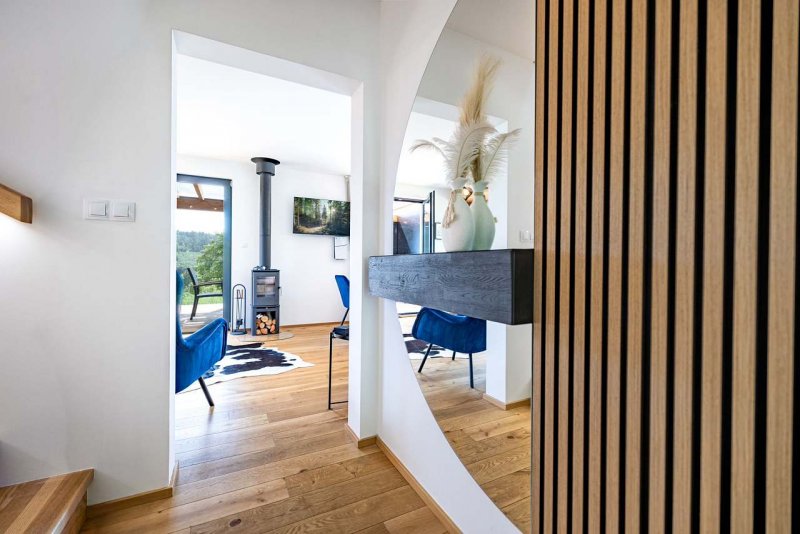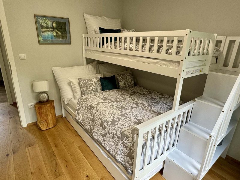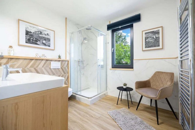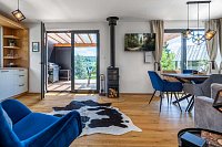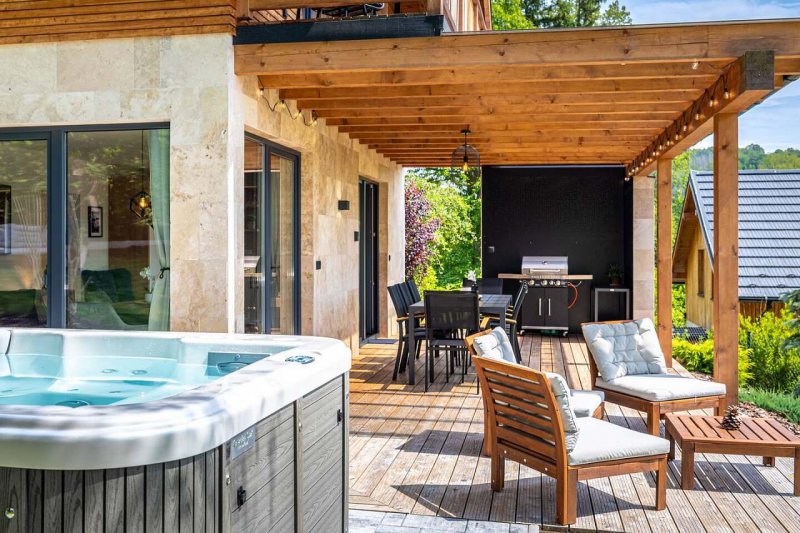Luxusní chata s vířivkou nad řekou Sázava - Stříbrná Skalice. Vkusně zařízená chata se nachází v obci Stříbrná Skalice v blízkosti krásné přírody, pár desítek metrů od řeky Sázavy a nedaleko Prahy. Nemovitost je umístěná v chatové osadě s kouzelnou atmosférou a úžasným výhledem do údolí řeky Sázavy. Chata poskytuje komfortní ubytování pro 8 osob ve 4 ložnicích s možností až 3 přistýlek z nichž jedna z nich je vhodná pouze pro malé dítě. Tři ložnice jsou umístěny v prvním patře chaty, dvě z nich mají přímý vstup na velký balkón s překrásným výhledem a posezením. Třetí ložnice má dvě samostatná lůžka s možností dvou přistýlek a smart TV. Dále se v patře nachází krásná, velká koupelna s vanou, WC a dvěma umyvadly. V přízemí najdete jednu ložnici s patrovou postelí a druhou koupelnu se sprchovým koutem, WC a dvojitým umyvadlem. Obývací části dominuje stylová, plně vybavená kuchyňská linka s kávovarem Nespresso, krbová kamna, designová sedací souprava, velký jídelní stůl a Smart TV s O2 TV, Netflix, Apple TV, HBO Max, Disney+, Voyo a Playstation 5 a zvuková aparatura Bose. Z obývací části se vstupuje na velkolepou terasu s vířivkou, plynovým grilem a pohodlným posezením. V chatě je též umístěna pračka a sušička prádla. Na zahradě je ohniště a pro děti krásné hřiště s houpačkami a skluzavkou. V ubytování vám samozřejmě poskytneme ložní prádlo, ručníky, župany, toaletní papír a mýdlo. V kuchyni jsou k dispozici kapsle do kávovaru Nesspreso, čaj, základní koření a nějaké překvapení. Parkování je možné přímo u objektu. Celá oblast nabízí mnoho možností jak pro relaxaci tak i pro aktivní odpočinek (cyklistika, turistika, houbaření, rybaření, vodácké sporty). V blízkém okolí najdete obchod s potravinami, restaurace a spoustu zajímavých míst k návštěvě (Sázavský klášter, hrad Český Šternberk, Kutná Hora, zámek Konopiště a další). Nudit se u nás nebudou ani děti, na zahradě je připraveno dětské hřiště, vířivka, v domě PS5 a výběr hraček, v docházkové vzdálenosti od chaty je Funpark Pyzúú nebo můžete navštívit Farmapark Soběhrdy. Těšíme se na Vaši návštěvu!