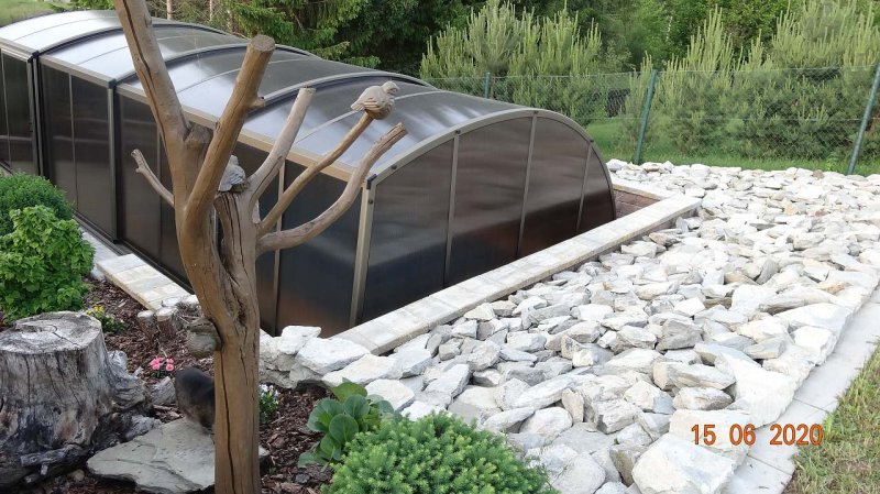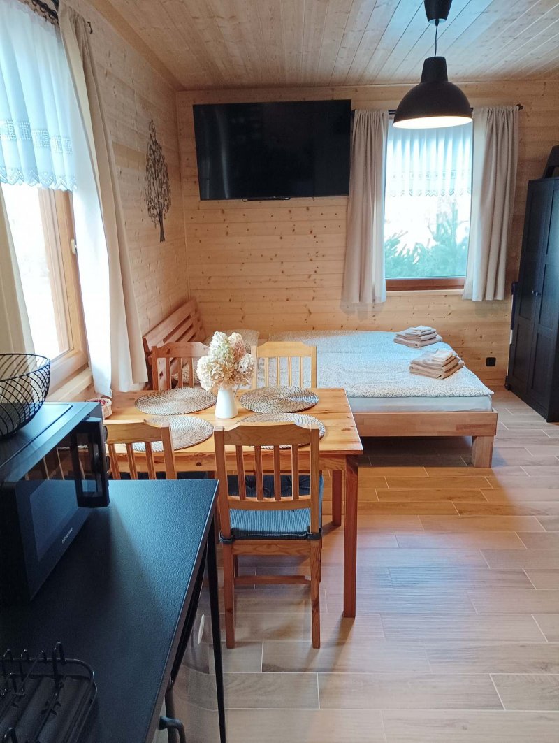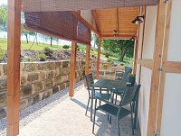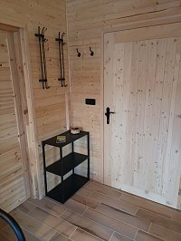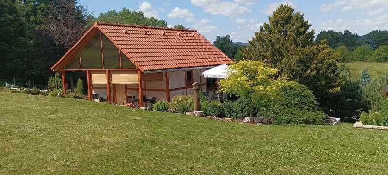 Chata je umístěna na jednom oploceném pozemku majitelů chaty, ale postavena tak, aby zajistila rekreantům naprosté soukromí. Zastřešená terasa, venkovní posezení s grilem a ohništěm. Výhodou je parkování přímo u chaty, za zavřenou bránou. Chata též disponuje krytým, relexačním bazénem se slanou vodou, vyhřívaný tepelným čerpadlem (bazén 3x5x1,5 m, zakrytí 10x4 m), včetně solární sprchy. Bazén je umístěn za domem majitelů, bude využíván pouze klienty (majitelé v době ubytování klientů využívat bazén nebudou), přístup po betonovém chodníku, nebo po louce.