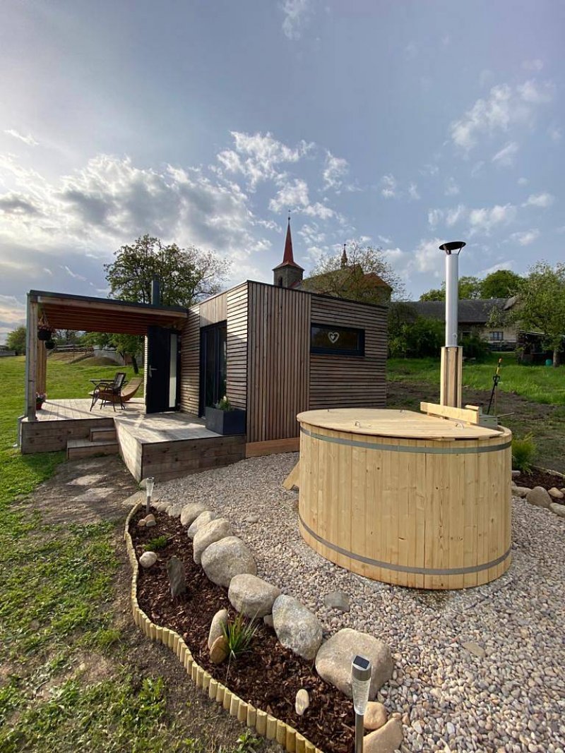 Na zahradě se nachází celkem dvě unikátní chatičky, které jsou od sebe vzdáleny 60 m a oddělují je stromy. Soukromí je tedy zajištěno. Koupaci sud vedle chaty. Chatičky se nachází v Českým ráji - Újezd pod Troskami mezi ovocnými stromy na rozsáhlé zahradě, poblíž kostelíčku, jenž dodává místu klid a unikátní vesnickou atmosféru. Možnost romantického grilování v zahradě.