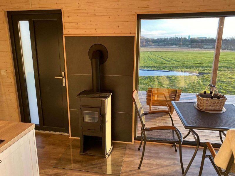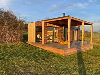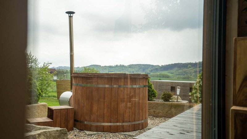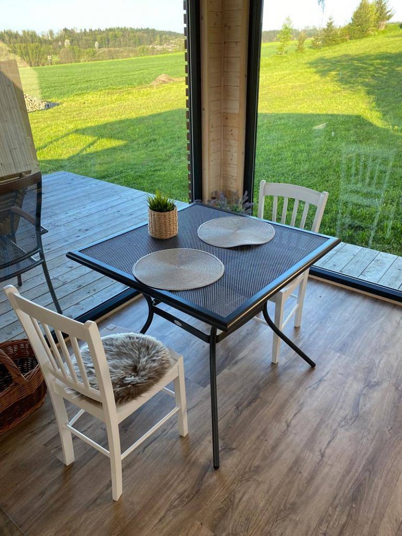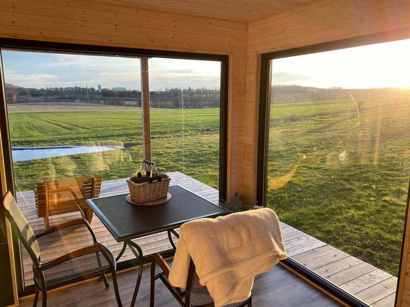 Chata,, Na Louce je zařízena ve světlém provance stylu s venkovní zastřešenou terasou a výhledem na louku a rybník. Ke koupání můžete využít wellness sud, kterym disponuje každá chata. Společně pro obě chaty je také finská sauna.