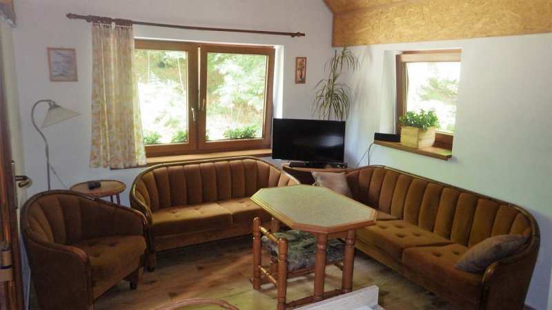 Chata v obci Bystřice: 3 ložnice, celkem pro 5 až 9 osob. Orientační cena (za osobu za noc): celoročně 350kč.