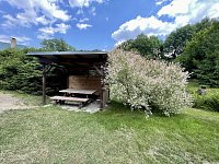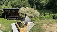 Posezení na zastřešené terase nabízí krásný výhled do zeleně i při dešti.