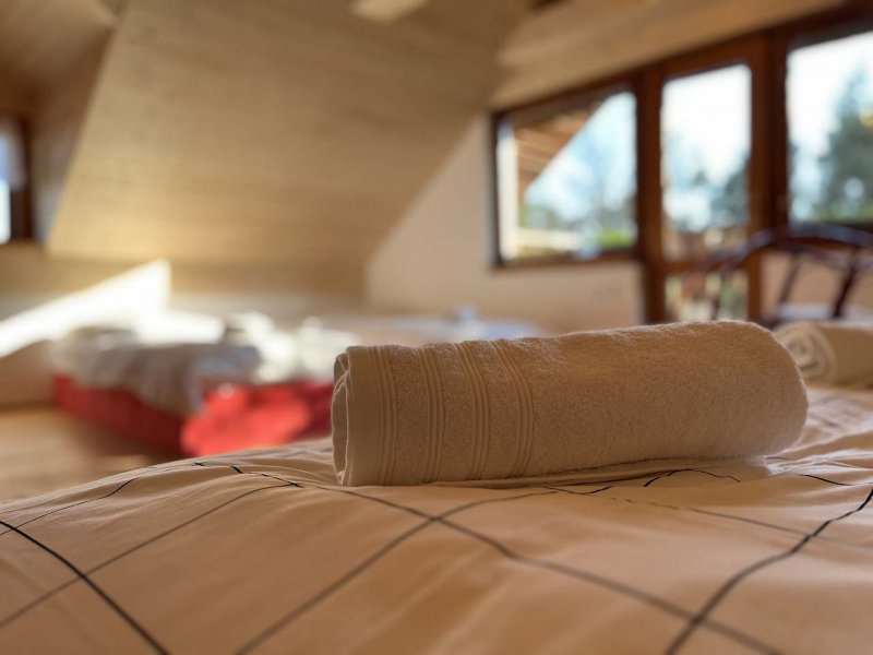 V podkroví chaty je společná ložnice pro 6 osob (+ dětská postýlka).