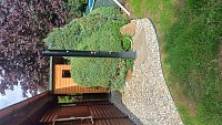 Na oplocené zahradě o rozloze 330m² se nachází venkovní posezení s pergolou, grilem, bazén o prěru 3.6m x 5.8m, solární sprchou. Za poplatek je možné využít infra saunu nebo rožeň na kuře.