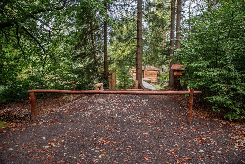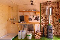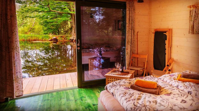Je vybavena manželskou postelí, krbovými kamny s výměníkem pro ohřev vody, sprchovým koutem, kuchyňkou se základním vybavením, kempingovým vařičem, grilem na ohniště, lehátky, židličkami a stolečkem ve kterém najdete deky pro zahřátí. Světlo obstarají dobíjecí lampy s pawerbankou. Připraveno pro Vás bude naštípané dřevo, ložní prádlo, osušky, ručníky a FeelEco přípravky(jar, šampon, sprchová gel) pitná voda. Naší originální kadibudku najdete na břehu hned vedle mola. Příjezd je kolem osady Řachvaj, kde prosíme o pomalý průjezd. Cesta Vás dovede až k rybníčku, kde najdete závoru s parkovacím místem.