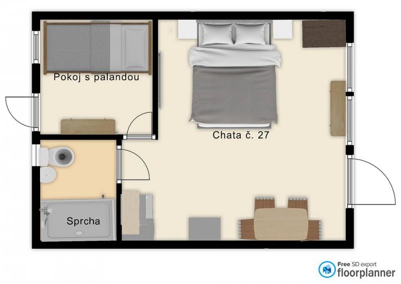 Chata v obci Doksy: 1 ložnice, celkem pro 1 až 4 osoby. Orientační cena (chata za noc): léto 1.400kč.