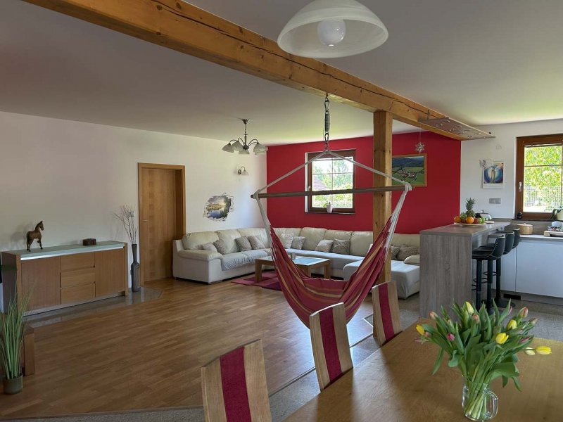 Apartmán v obci Horní Chrášťany: 3 ložnice, celkem pro 1 až 8 osob. Orientační cena (za osobu za noc): léto 306kč, zima 333kč.