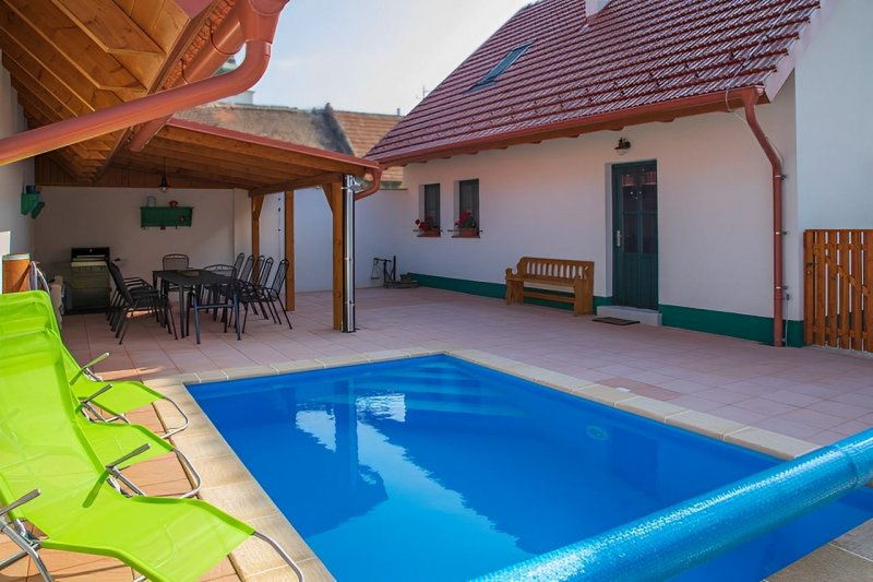 Chalupa Grácie pod Pálavou II je naše druhá chalupa ze tří, samostatně stojících chalup v obci Přítluky, uprostřed Pálavy. Chalupa je nově postavená v roce 2018 a zařízená ve venkovském stylu, vhodná pro rodinnou dovolenou s dětmi nebo větší skupiny přátel. Součástí je klimatizace a tepelně vyhřívaný venkovní bazén 5 x 3m a zastřešená pergola se zahradním nábytkem a plynovým grilem.