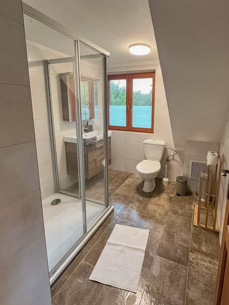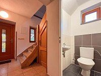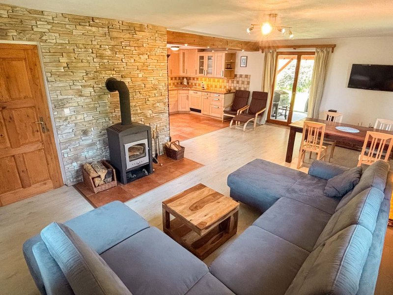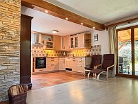 Kuchyně s obývacím prostorem se nachází v přízemí, v patře jsou 3 ložnice s manželskými postelemi, koupelna s toaletou a sprchovým koutem. Pohovka v obýváku je rozkládací. Vytápění poskytuje klimatizační jednotka (tepelné čerpadlo vzduch - vzduch) a krbová kamna. Ložnice v patře jsou vytápěny olejovými radiátory.