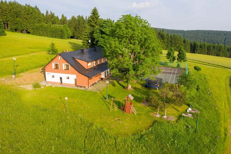 Penzion v obci Říčky v Orlických horách: 16 pokojů, celkem pro 25 až 57 osob. Orientační cena (penzion za noc): léto 800kč, zima 900kč.