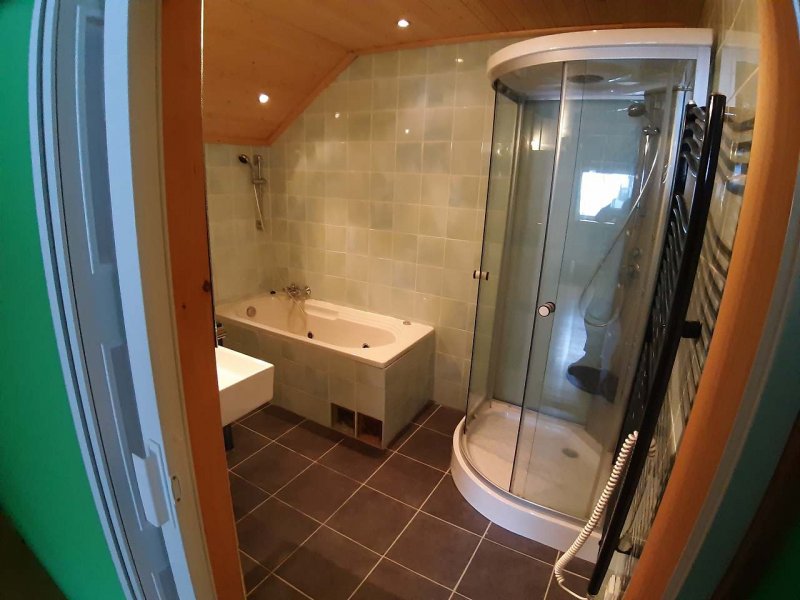 Na prostorné zahradě s potokem je částečně krytá terasa, venkovní bazén a dětské hřiště, trampolína, houpačky, ohniště a grill.