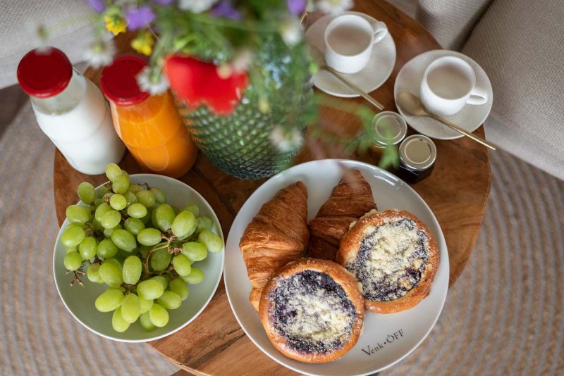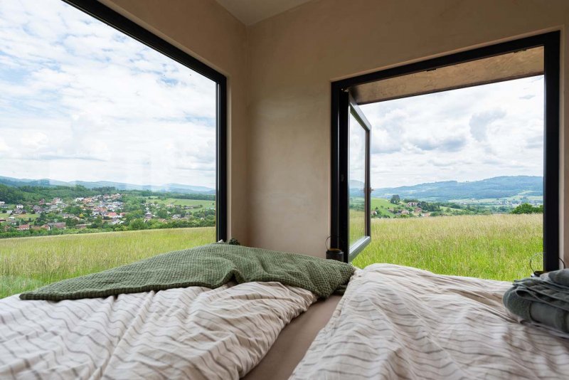 Uvnitř: Útulnost a výhledy. Interiér KOOLNY je útulný, světlý a promyšlený. Najdete zde: Velké panoramatické okno s výhledem do krajiny přímo z postele, komfortní manželskou postel s úložným prostorem, kuchyňský kout s plynovým vařičem, dřezem, ledničkou, veškerým nádobím a stylovým obkladem, příjemný jídelní a odpočinkový kout s pohodlnými křesly a dřevěným stolkem. Z terasy si vychutnáte ticho přírody, sklenku vína nebo ranní kávu – venkovní posezení s výhledem je ideální pro chvíle klidu i romantiku.