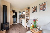 KOOLNA – Off - grid Tiny House v srdci malebného Valašska. Hledáte místo, kde si opravdu odpočinete? Vítejte v KOOLNĚ – stylovém tiny housu pod kopcem, obklopeném loukami a lesy Valašska. Je to ideální útočiště pro ty, kteří chtějí zpomalit, být blíž přírodě a zároveň si dopřát pohodlí v promyšleném a šetrném prostoru. Soběstačnost a respekt k přírodě: KOOLNA je zcela off - grid, což znamená, že není připojena k běžným sítím. Funguje zcela soběstačně, s minimálním dopadem na přírodu. Elektřina ze solárních panelů – dostatek energie pro světla, zásuvky i ledničku. 100l nádrž na vodu – zásoba na běžné denní potřeby. Separační toaleta – ekologická a bez zápachu, ideální pro tento typ ubytování. Každý detail jsme navrhli s ohledem na udržitelnost a pohodlí zároveň.