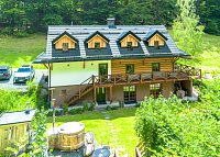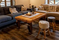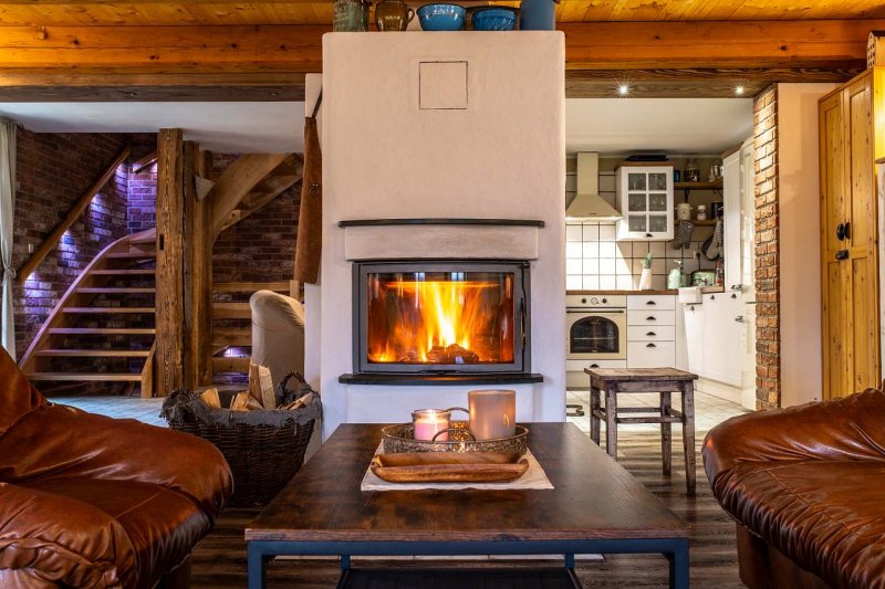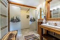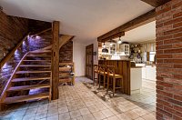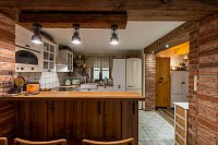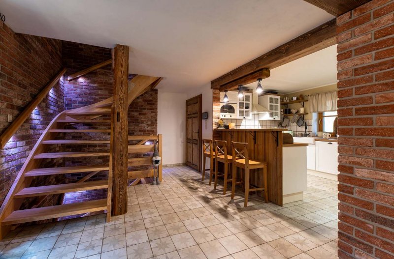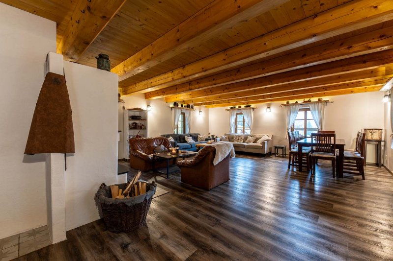 Uvnitř se dřevo potkává s jemným světlem. Ručně vyřezávané trámy, schody s podsvícením jako z pohádky, krb, u kterého se zastaví čas. Obývací pokoj plynule přechází v jídelnu a kuchyni – prostor, kde se žije, směje i mlčí. A když se setmí, světla vedou cestu nahoru k ložnicím, které pojmou i početnější rodinu či skupinu přátel. Každé patro má svou koupelnu, pohodlí a klid.