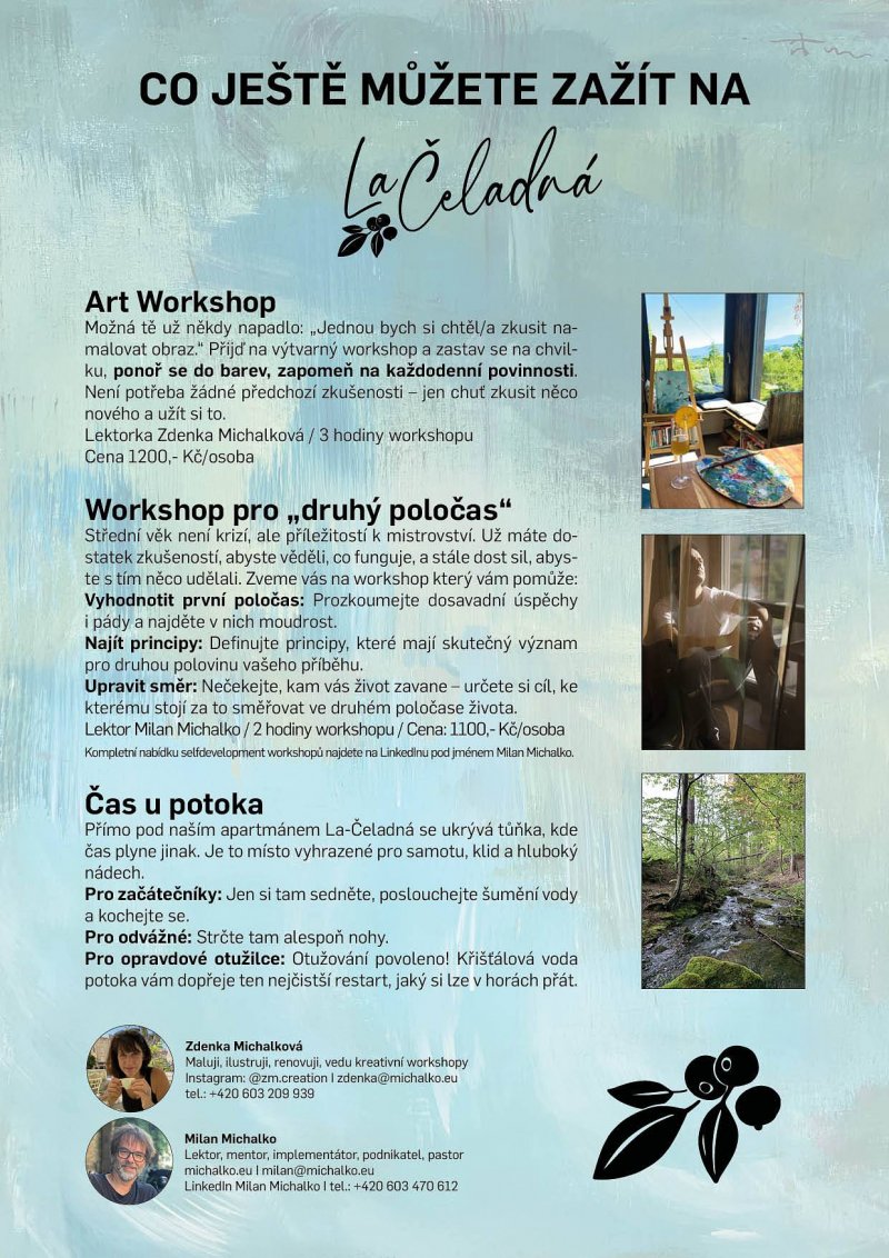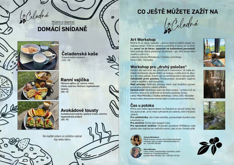 Z okna tohoto místa můžete obdivovat panoramatický výhled na Lysou Horu nebo relaxovat na terase. La - Čeladná je ideální destinací pro ty, kteří hledají odpočinek v přírodě, touží po turistice, procházkách po lese nebo chtějí hrát golf v nedalekém golfovém resortu. V létě si můžete užít samosběru borůvek přímo na zahradě. Po dohodě můžeme nabídnout snídaně nebo ranní kávu. Přijeďte a objevte toto úchvatné místo! Vše je připraveno tak, abyste mohli zažít skutečné „čeladenské lázně ducha :-).