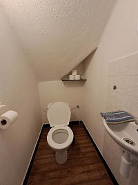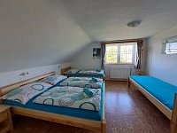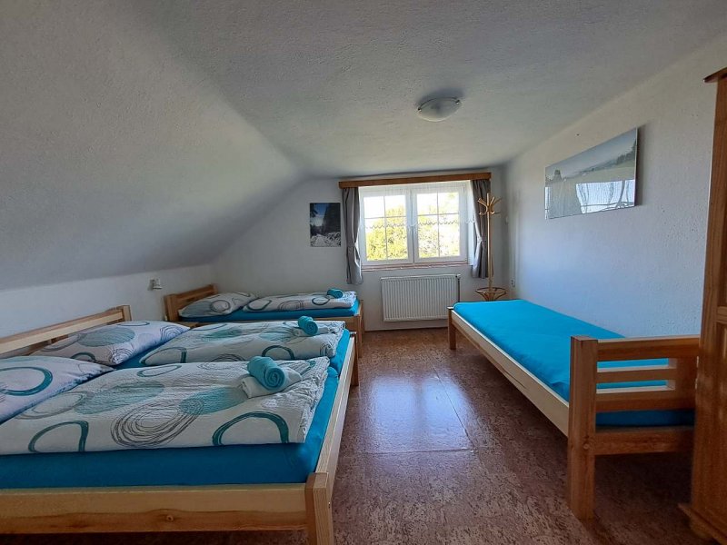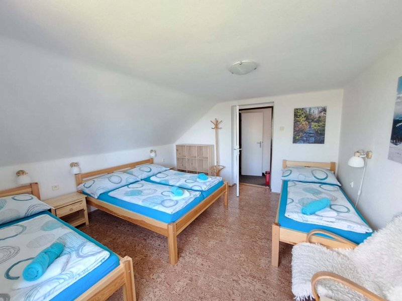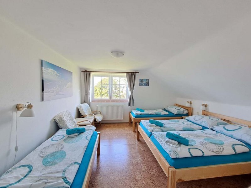 Nabízíme 8 pokojů, celkem pro 26 osob. Na patře s pokoji se nachází společná vybavená kuchyňka, herní koutek pro děti, chodba s posezením a TV. O patro níže je společenská místnost s TV, toalety blíže ke společenské místnosti, stolní fotbal či nabídka společenských her. Možnost zapůjčení výčepního chlazení na jeden sud za poplatek 300Kč (k dispozici obě narážecí hlavice).