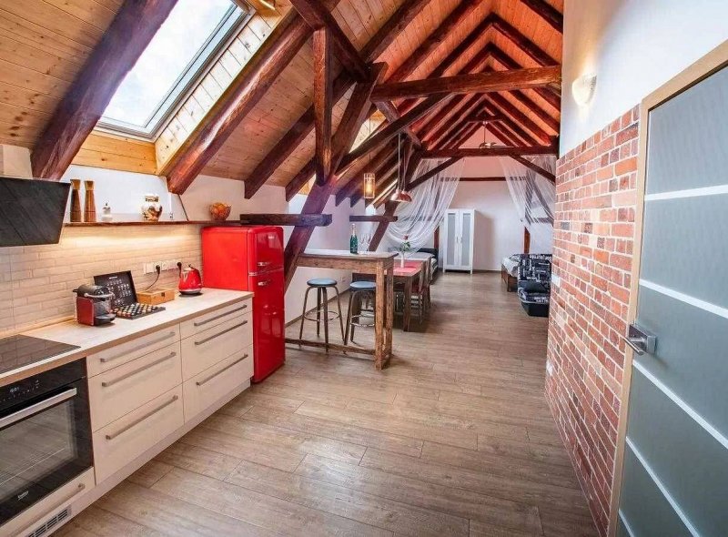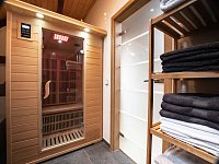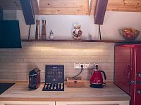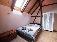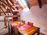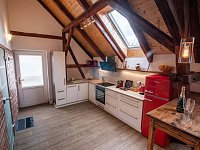 Podkrovní penzion v rodinném zázemí nabízí jedinečnou atmosféru, pohodlí a naprosté soukromí. Budete totiž jedinými obyvateli samostatné bytové jednotky, s vlastní zahrádkou, terasou, grilem a saunou. Kompletní renovace prostoru proběhla v roce 2018 a nabízí tak kontrast moderní technologie a zachovalých dobových trámů. Elektrická střešní okna na dálkové ovládání, elektrické venkovní rolety, podlahové topení v celém prostoru, dobře vybavená kuchyň s indukční deskou, velká LED televize s plochou obrazovkou a satelitními programy, LED podsvícení prostoru. Infrasauna zdarma, Nespresso kávovar (kapsle zdarma). Při ubytování na týden a víceí přivítání v podobě láhve sektu. Po domluvě je možné využít různých služeb (praní, doprava, apod. ) Nově nabízíme možnost zapújčení elektrického retroskútru nebo jízdních kol.