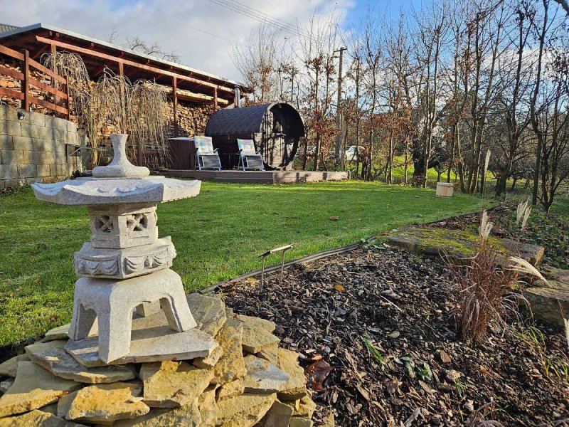 Zažijte jedinečné ubytování pod majestátním hradem Buchlov, kde se spojuje pohodlí, elegance a klid zenové filozofie. Dům je navržen pro různé typy skupin až do 12 osob: první patro pro 4 osoby a druhé patro pro 8 osob. Vybavení zahrnuje: hernu a posilovnu, krb s posezením a vodní dýmkou, venkovní bazén a saunu, basketbalové hřiště, terasu s posezením, zapuštěnou trampolínu. Součástí objektu je také zenová zahrada, navržená jako místo pro očistu těla, mysli i duše. Jednotlivé zóny zahrady vás přivedou k pocitu klidu a harmonie, zatímco meditační sdělení a promyšlený design interiéru umocní váš zážitek.