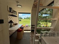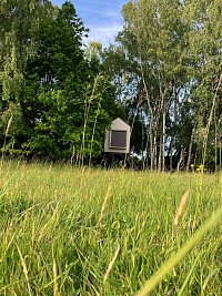 Hledáte klidné místo k odpočinku, kde se snoubí pohodlí s šetrným přístupem k přírodě? Posed V remízu v Nové Vsi nabízí výjimečné spojení udržitelného životního stylu a relaxace uprostřed krajiny, která uklidňuje i inspiruje. Skrze velká okna si užijete dech beroucí výhledy, v interiéru pak jednoduché, leč komfortní zázemí vytvořené s respektem k planetě. Celá stavba byla realizována v duchu ekologických principů. Využíváme obnovitelné zdroje energie, přírodní a výhradně rostlinné materiály a snažíme se být co nejméně invazivní vůči svému okolí. Posed přirozeně zapadá do okolního prostředí a je plně soběstačný. Uvnitř najdete příjemné místo pro 4–6 osob, jednoduchou kuchyňku, oddělenou kompostovací toaletu a útulné kryté posezení pod posedem. Každý detail je promyšlený – od recyklovaných a znovu využitých materiálů až po ručně vyráběné nebo repasované kousky vybavení, které mají svůj vlastní příběh. Zajímá vás, odkud pochází stůl, u kterého budete snídat? Nebo kdo a z čeho vyrobil gramofon, ze kterého se večer při západu slunce tiše ozve hudba, zatímco budete skrze velké okno sledovat srnky na pastvě? Vyvinuli jsme jednoduchou aplikaci, díky které můžete každý předmět v posedu „naskenovat“ a dozvědět se o jeho původu, materiálovém složení nebo příběhu jeho vzniku.