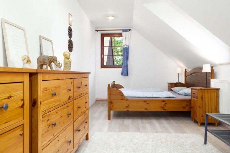 Apartmán v obci Mladá Vožice: 4 ložnice, celkem pro 2 až 14 osob. Orientační cena (za osobu za noc): celoročně 600kč.