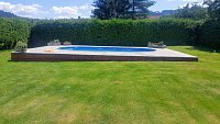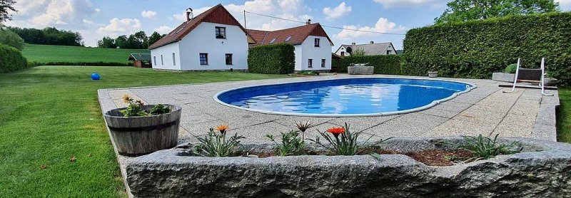 Šumavská vesnická chalupa s krásným travnatým, oploceným pozemkem 6000m². Oploceno tůjemi a smrky (výška 3m) s velkým bazénem slaným. viz letecké fotky. Ubytování zvláště vhodné pro vícepočetné rodiny s dětmi, pro které je udělané velké hřiště, trampolína velká, houpačky, hračky, atd, sportovce, houbaře, firemní školení atd, 60m2 zastřešená pergola s krbem a plně vybavenou kuchyní /teplá voda, odpad, lednička, plynový sporák, hrnce, talíře, skleničky atd. /