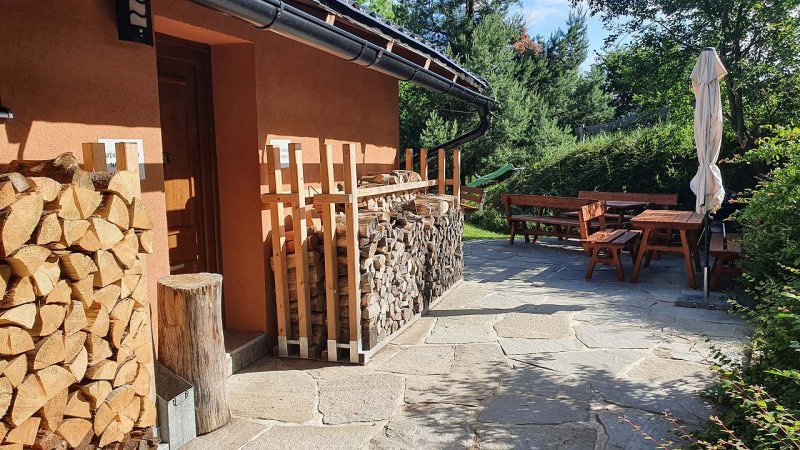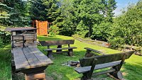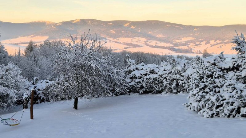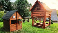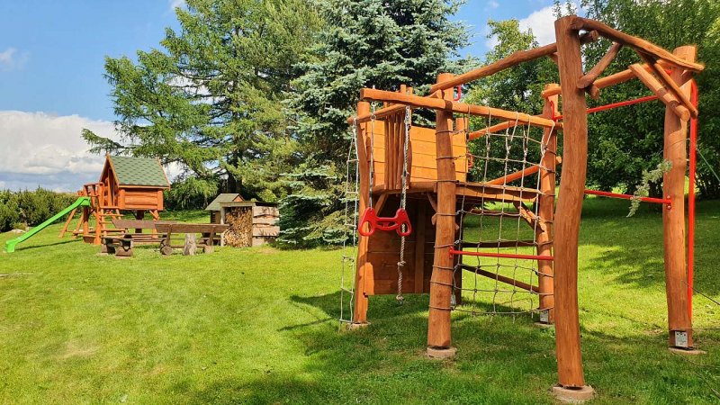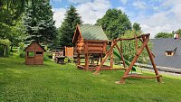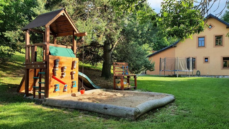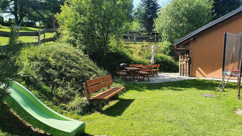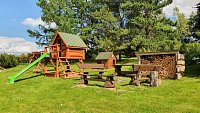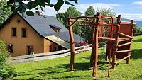 Děti vítány! Nově zrekonstruovaná chalupa nabízí ubytování pro 19 osob v 5 ložnicích. Nadstandardní zařízení je vhodné pro rodiny s dětmi, k dispozici jsou dětské postýlky, jídelní židličky, herna, v celém přízemí objektu je podlahové topení. Kolem chalupy je rozlehlá zahrada (cca 2500 m2) s dětským hřištěm a vlastním parkovištěm. Ze zahrady je dechberoucí výhled na okolní krajinu. V zimě nabízíme zapůjčení lyžařské výbavy pro děti zdarma!!!