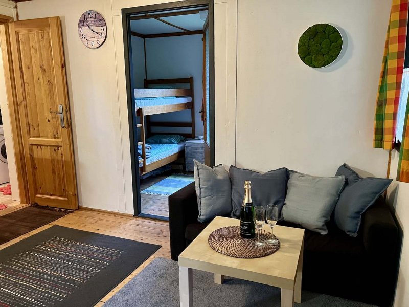 Chalupa v obci Mnichovice: 2 ložnice, celkem pro 1 až 6 osob. Orientační cena (chalupa za týden): léto 11.000kč, zima 10.000kč.