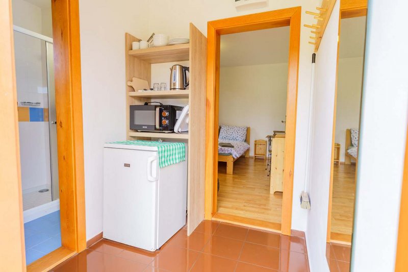 Nabízíme dva typy ubytování. 11 dvoupokojových bungalovů s kapacitou 5 lůžek a vlastní zastřešenou terasou s posezením. Dále nabízíme jednopokojové bungalovy bez terasy se 4 lůžky. Bungalovy jsou vybavené vlastním WC, sprchou a menším zázemím pro přípravu jídla (mikrovlnná trouba, rychlovarná konvice, lednička a základní nádobí). Všechny mají své elektrické vytápění. Samozřejmostí je možnost připojení k Wi - Fi. Pětilůžkové bungalovy jsou ideální pro rodiny s dětmi, protože disponují ložnicí a dalším pokojem se třemi lůžky. V případě potřeby můžeme zapůjčit dětskou postýlku. V ceně jsou zahrnuté lůžkoviny, ručníky a osušky.
