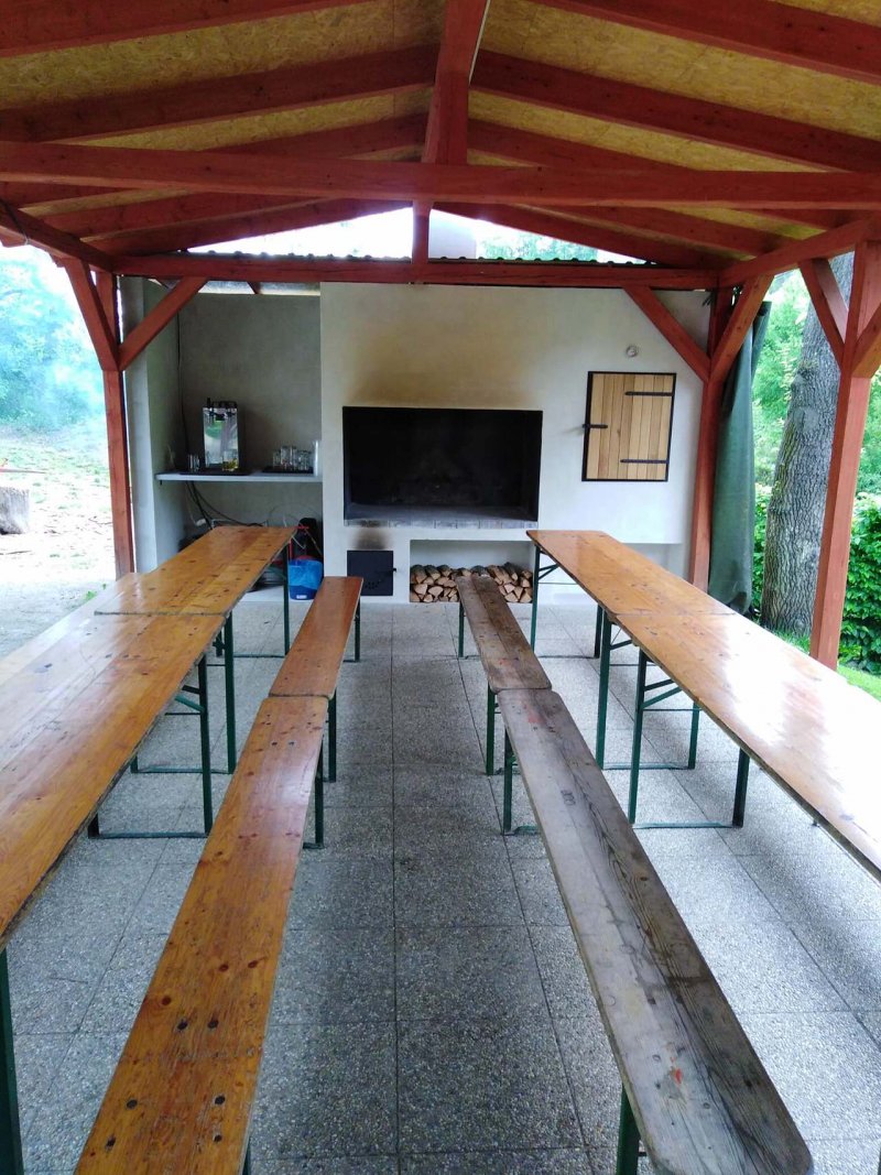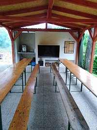 V prvním patře se nachází terasa. Zde je i je společenská místnost (stoly, židle, TV). Ke klidnému posezení je možné využít zahradní nábytek se slunečníky, vhodný na terasu. Za chatou je hřiště, přírodní ohniště s posezením a před chatou stůl na stolní tenis a bazén. K dispozici jsou pálky, míčky, síť na volejbal, míče, badminton nebo různé společenské hry.