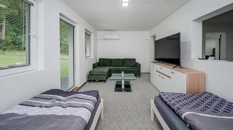 Moderní ubytování v srdci Beskyd – Obec Řeka. Hledáte ideální místo pro rodinnou dovolenou, teambuilding nebo sraz s přáteli? Naše ubytování v malebné obci Řeka prošlo kompletní rekonstrukcí a nabízí dokonalou kombinaci pohodlí, sportovního vyžití a relaxace. Nacházíme se v těsné blízkosti přírody, jen 200 metrů od letního koupaliště. Hlavní budova: Slouží jako centrum společného dění. Najdete zde: Velkou, plně vybavenou kuchyni (ideální pro společné vaření). Prostornou společenskou místnost. Dětskou hernu. Dámské a pánské toalety se sprchami. Relaxace a Wellness (v ceně pobytu! ). Po túře nebo sportu si zasloužíte odpočinek. U nás máte k dispozici: Koupací sud pod širým nebem. Suchou saunu, která vás prohřeje v každém ročním období.