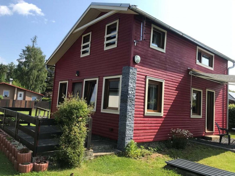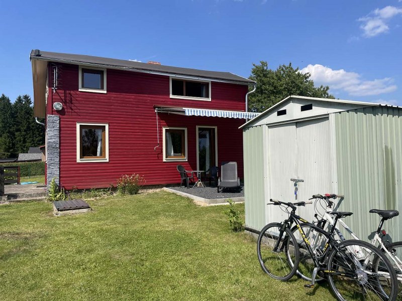 Robinova chata v Rumburku je postavena v tradičním severském stylu, má dřevěnou fasádu s kamennými prvky a kompletní tepelnou izolaci.
