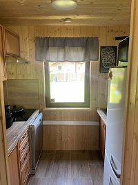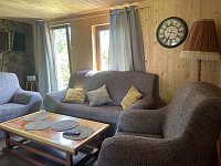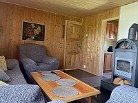 Interiér chaty kombinuje dřevěné obložení s moderními prvky ve všech místnostech.